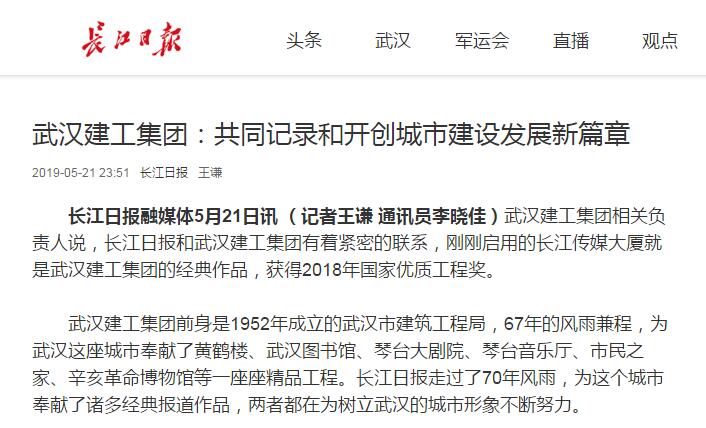 長江日報融媒體5月21日訊 (記者王謙 通訊員李曉佳)武漢建工集團相關負責人說,長江日報和武漢建工集團有著緊密的聯系,剛剛啟用的長江傳媒大廈就是武漢建工集團的經典作品,獲得2018年國家優質工程獎。