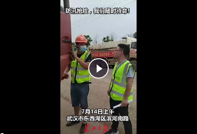 武漢建工集團防汛搶險第一分隊的260多位隊員與數十臺搶險車輛及機械設備,在武漢市東西湖區濱河南路集結待命。