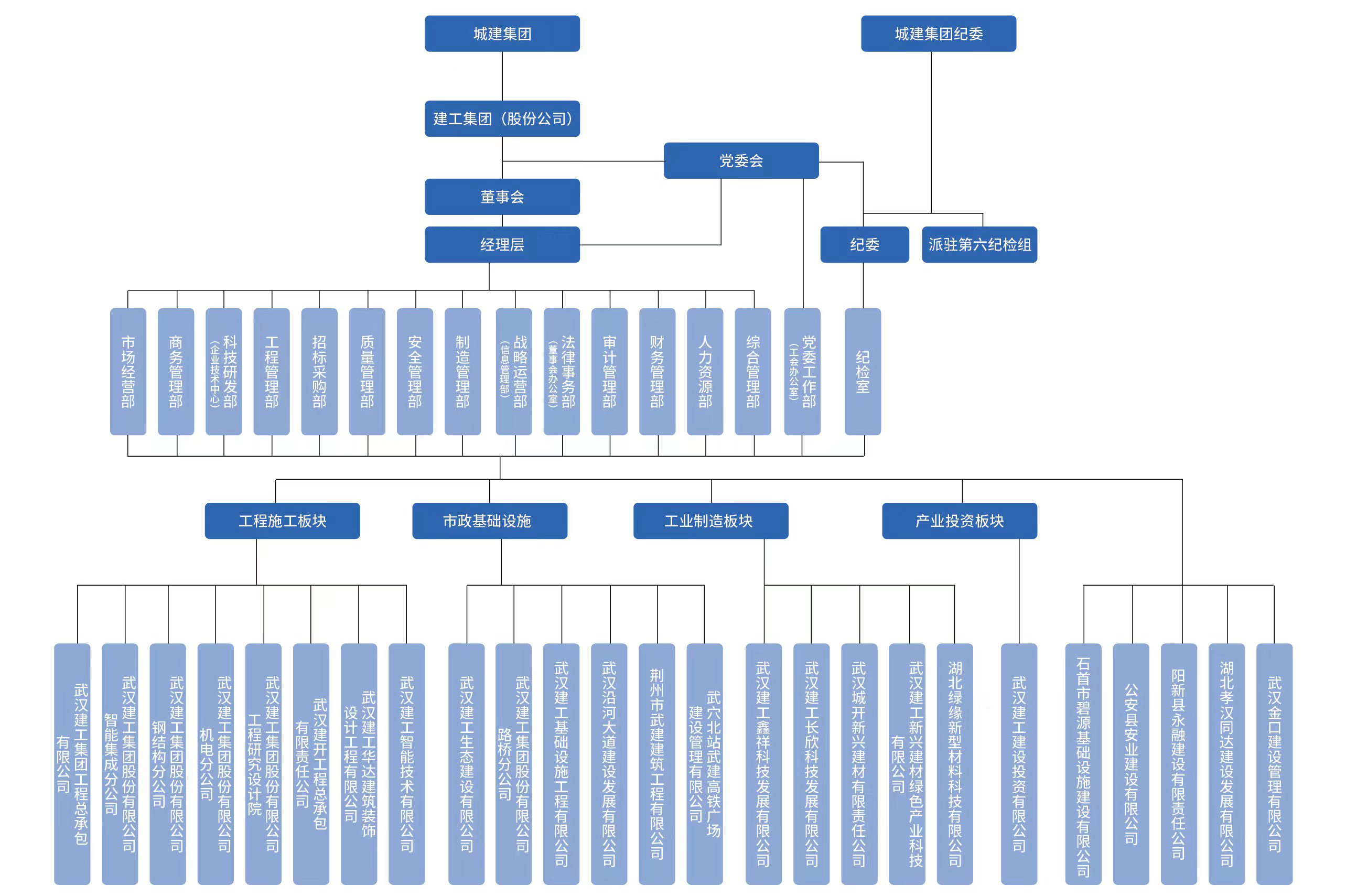武漢建工(集團)有限公司(以下簡稱武漢建工)是武漢市第一批國有資產授權經營單位。前身為1952年成立的武漢市建筑工程局,1983年由行政局體制轉變為總公司企業體制,1992年掛牌成立全國首家城市建筑總承包集團,1999年發起設立旗下核心企業武漢建工集團股份有限公司。2020年經市委市政府批準,武漢建工等市屬7家國有企業合并設立武漢城建集團(現為中國企業500強),武漢建工成為城建集團最大子集團。