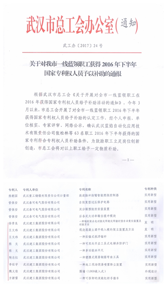 為鼓勵職工立足崗位創(chuàng)新創(chuàng)造,近日武漢市總工會對2016年下半年獲得國家專利權(quán)的一線職工發(fā)放了專利補助。經(jīng)過個人申報、單位核實、專家評審、網(wǎng)絡(luò)公示,全市共確認(rèn)了63名具備補助條件的職工,其中武建集團的徐貴良、熊文、王文瑋等7位員工取得的《一種鋼桁架合攏對接處焊縫襯墊自動復(fù)位裝置及對接方法》等9項專利成果入選。