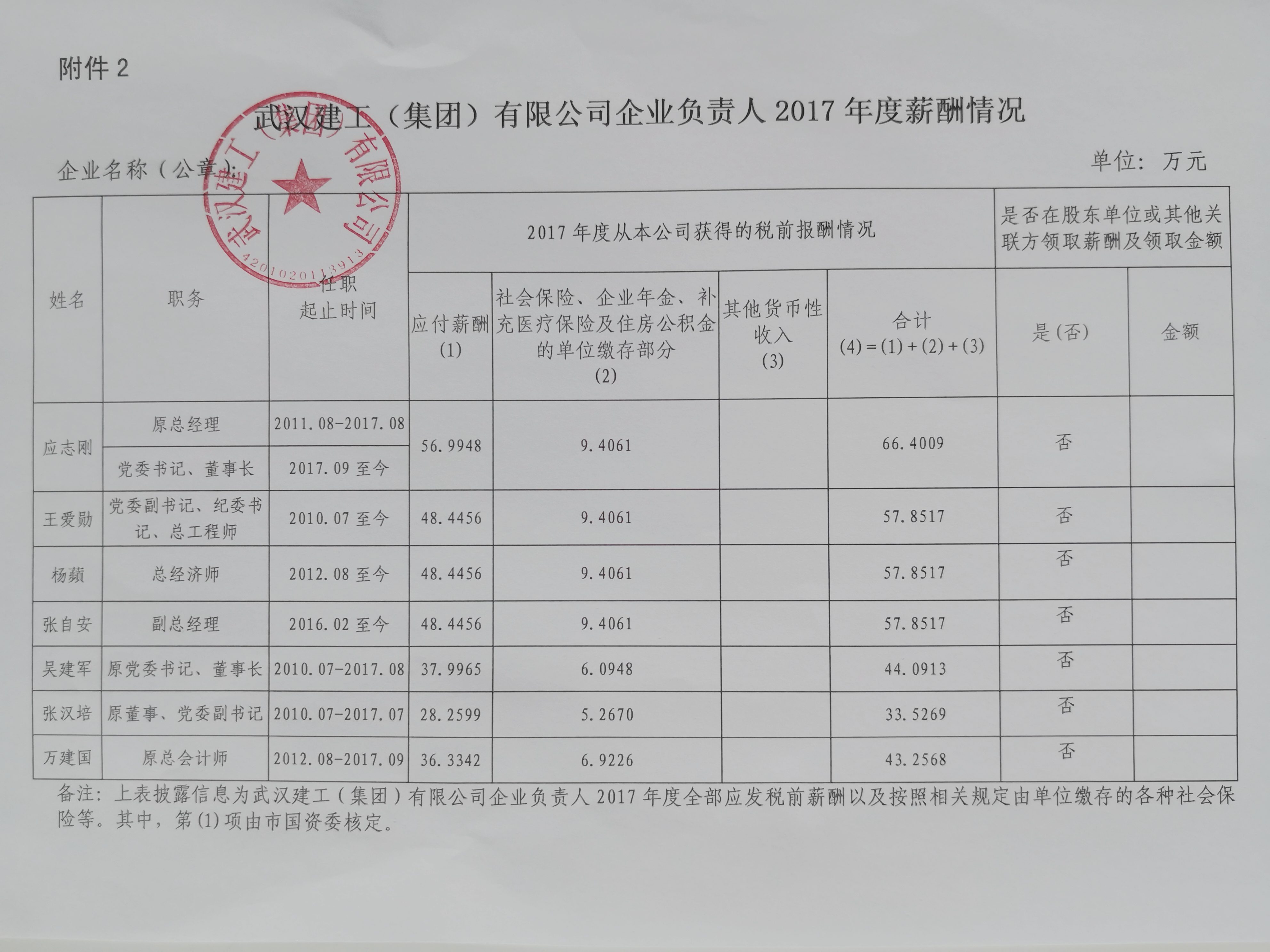 武漢建工(集團)有限公司企業負責人2017年度薪酬情況